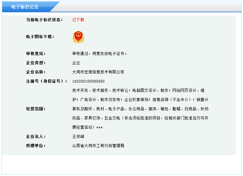 8月30日,宏微信息技術(shù)通過山西省工商行政管理局經(jīng)營性網(wǎng)站認(rèn)證,獲得經(jīng)營性網(wǎng)站“電子標(biāo)識(shí)”,工商紅盾標(biāo)識(shí)號碼為