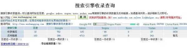 通過圖3大家可以發(fā)現(xiàn),通過這個(gè)網(wǎng)站查詢能夠一次性查出該網(wǎng)站各個(gè)搜索引擎的收錄和反向鏈接情況。還能查到googlePR值和sogouPR值。ALEXA排名和中國網(wǎng)站排名也一次性都查了出來。另外還有該網(wǎng)站的百度最近的收錄情況,百度快照日期,網(wǎng)站導(dǎo)出的鏈接數(shù)量等等。一次性把網(wǎng)站很多重要的質(zhì)量指標(biāo)都查了出來。這樣大家想了解自己網(wǎng)站和合作網(wǎng)站的基礎(chǔ)質(zhì)量情況的時(shí)候,就可以通過這個(gè)工具一目了然。