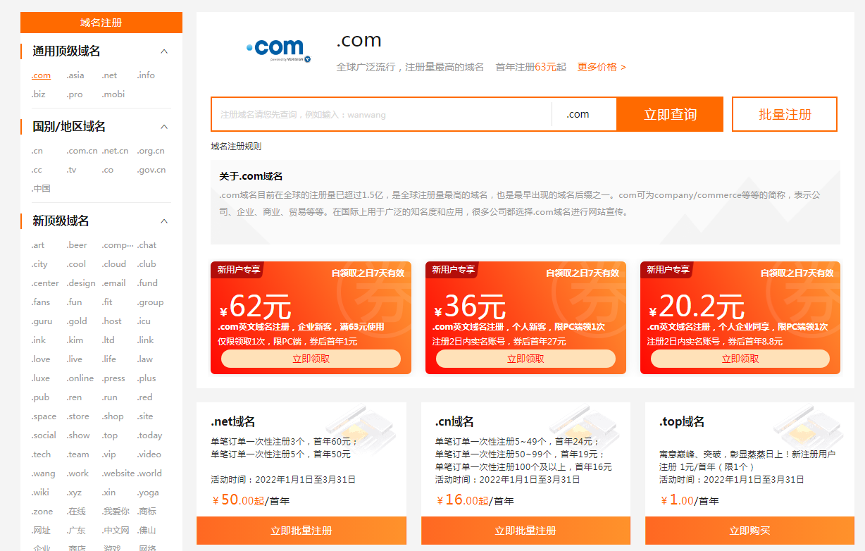 域名(需每年續(xù)費) 國內域名注冊商一共也沒多少家,全國比較知名的就阿里云(以前的萬網)、新網這些的,其他小的注冊商幾乎都是這些大公司的代理,域名注冊費用每年都在變,但是基本上價格浮動不是很大。