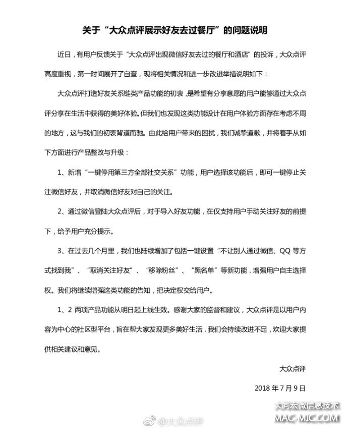 對此,大眾點(diǎn)評通過官方微博發(fā)布聲明,對因相關(guān)產(chǎn)品功能給用戶造成的困擾表示誠摯道歉,并提出了三條整改措施,包括新增“一鍵停用第三方全部社交關(guān)系”功能;通過微信登錄并導(dǎo)入好友關(guān)系,在支持用戶手動(dòng)關(guān)注的情況下給予充分提示;增加包括一鍵設(shè)置“不讓別人通過微信、QQ等方式找到我”“取消關(guān)注好友”“移除粉絲”“黑名單”等新功能。